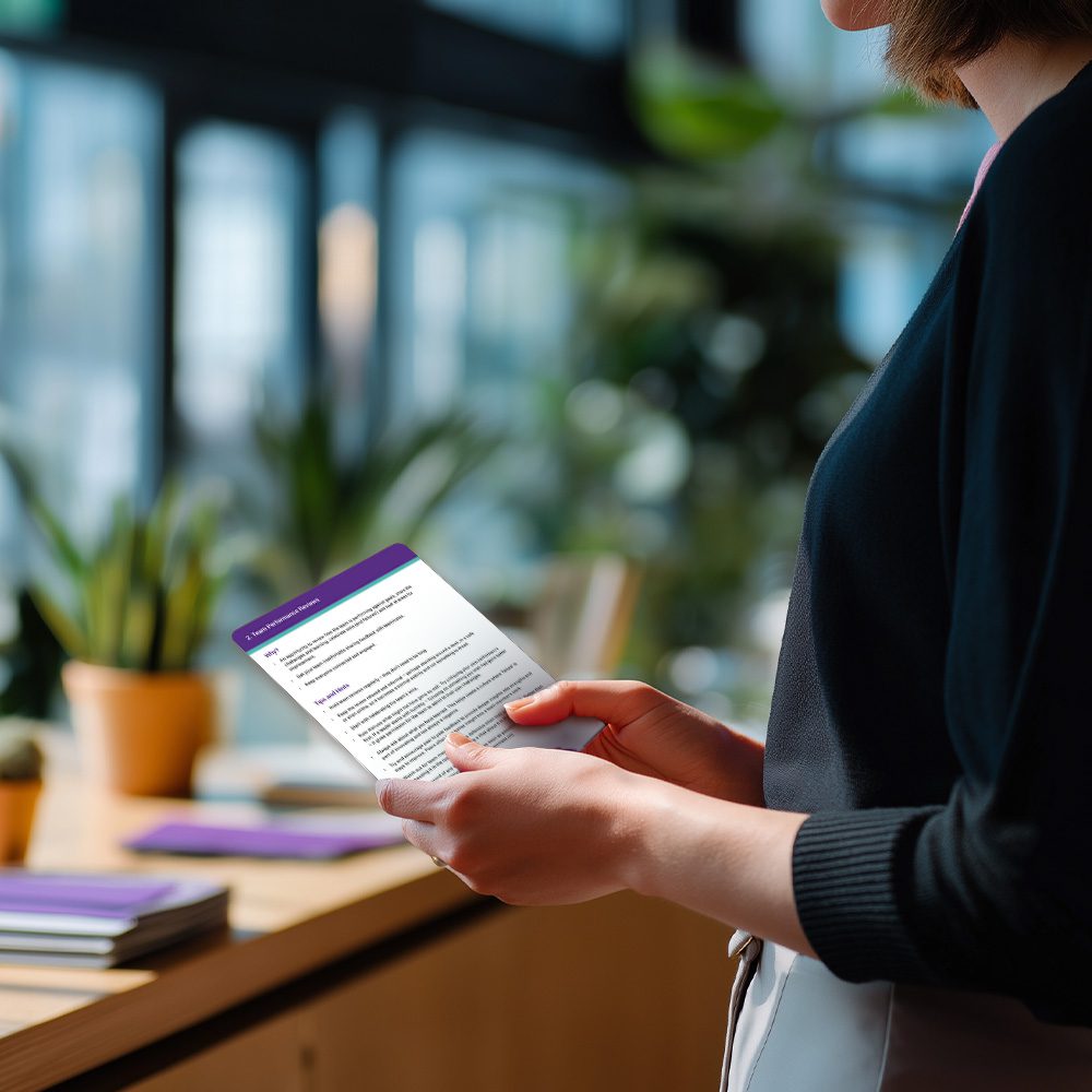 A box of seven punchy cards, each focused on a key team leadership moment: